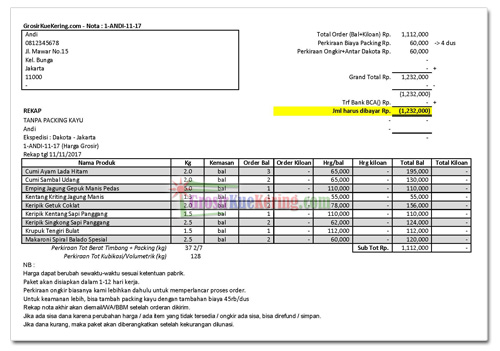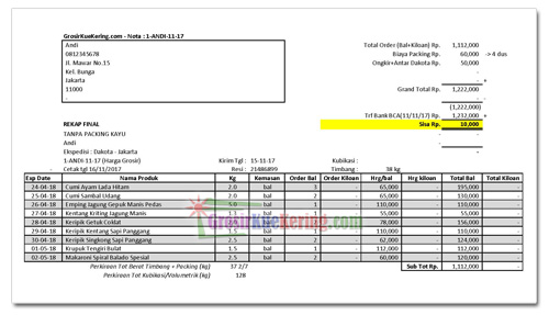 6. Setelah paket dikirim maka didapatkan kepastian ongkir dari pihak ekspedisi dan akan kami kirim rekap akhir order Anda beserta keterangan expired date dari tiap-tiap snack/kue, dana sisa/kurang, nomor resi pengiriman, dll. seperti contoh berikut :