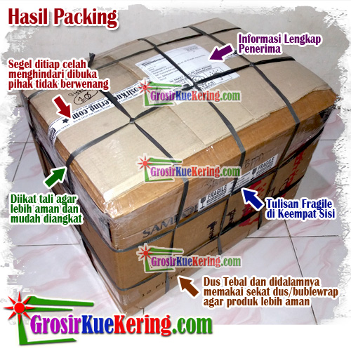 2. Semua snack/kue kami packing kuat menggunakan dus rokok yang tebal sehingga ada penambahan biaya packing 10rb/dus kecil, 17.5rb/dus rokok besar, dan 20rb/dus rokok jumbo (biaya meliputi dus+lakban+tali+penyekat/bublewrap+handling fee).